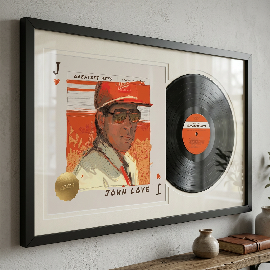 A custom retirement gift for John Love, designed as a framed record sleeve featuring original artwork and a curated “tracklist” of career highlights. The cover showcases a hand-drawn portrait layered with key moments and milestones from his career, brought to life through an energetic, sketch-driven illustration style.